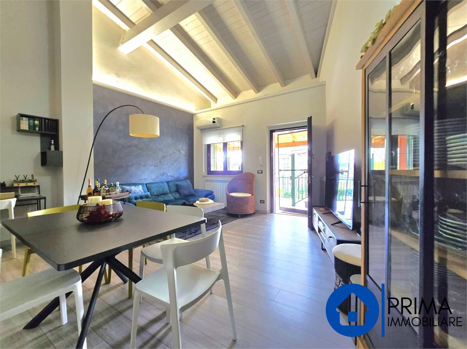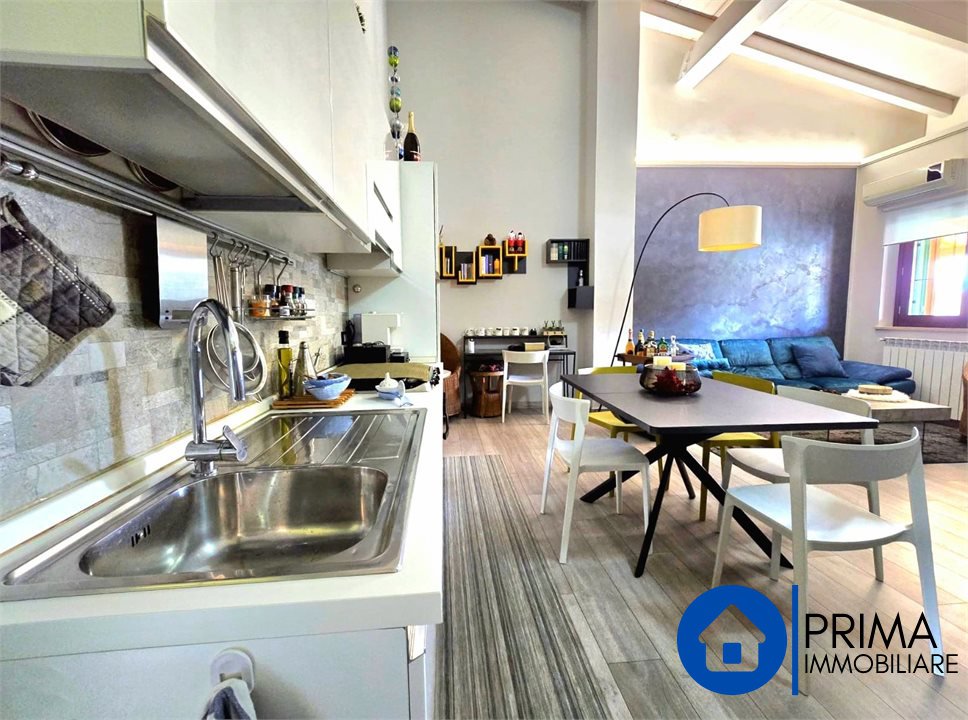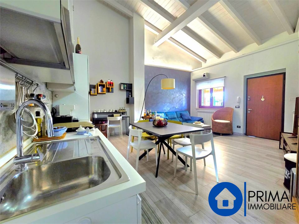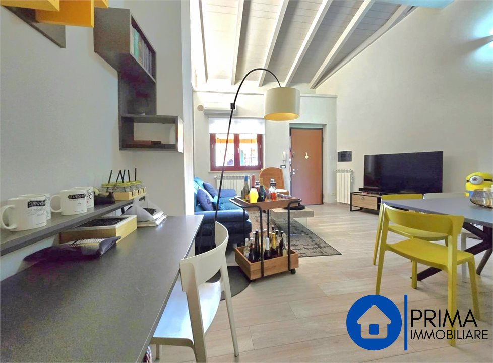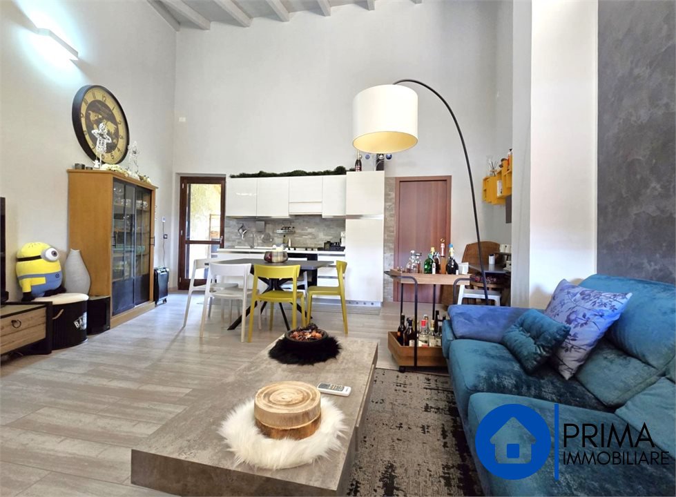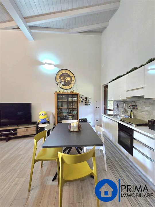 The apartment is located on the first floor with access from a flight of external stairs to a small balcony with a gate. From the armored door we enter the splendid open space living area consisting of a living corner and a dining area with an open kitchenette, the high ceiling with exposed wooden beams that allows you to create a mezzanine for a hobby area or a study is beautiful.