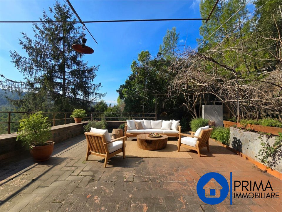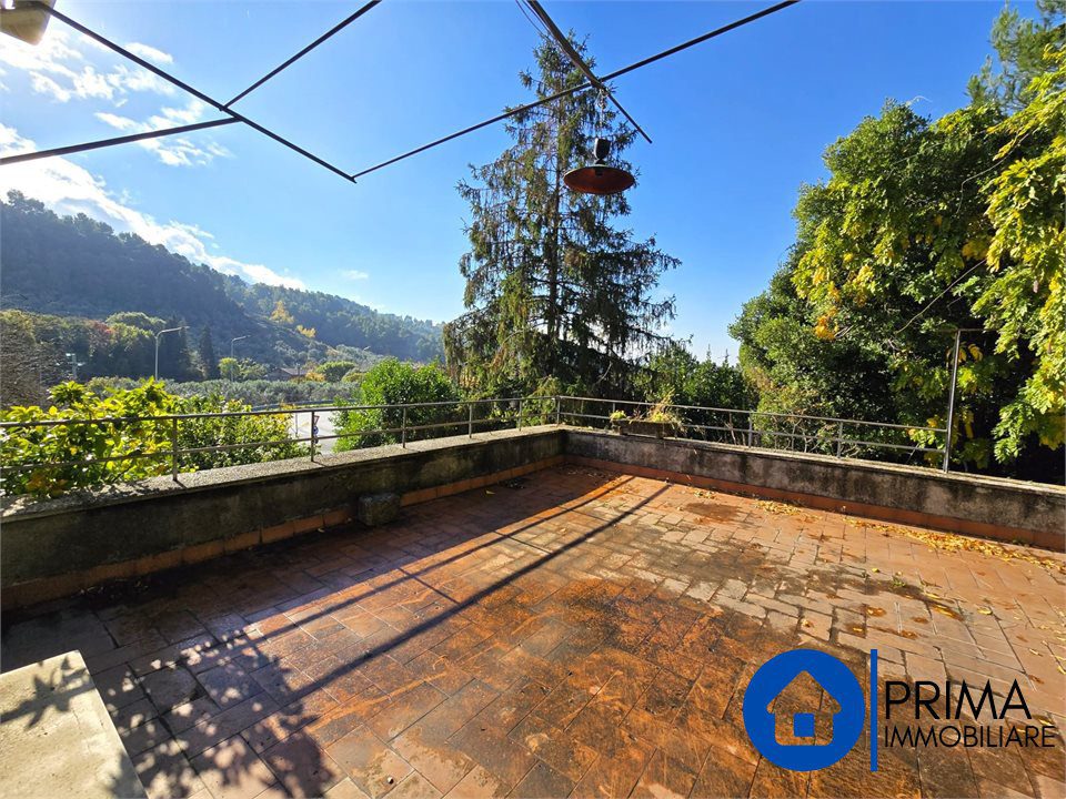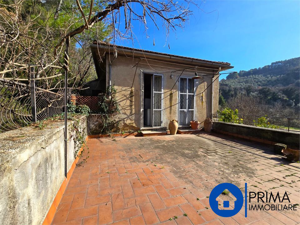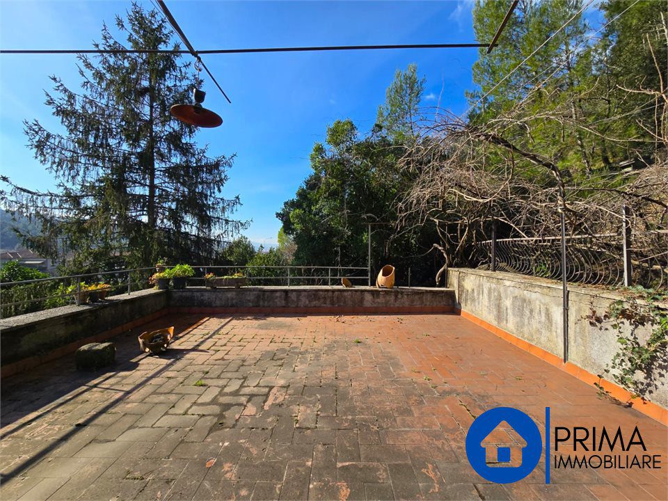 The upper level is the one where the actual house is located and consists of the living room with fireplace and double windows, the separate kitchen served by another fireplace and access to the habitable terrace of about 45sqm. overlooking the greenery. We then have three bedrooms, one of which has access to the terrace and the bathroom with bathtub and window.