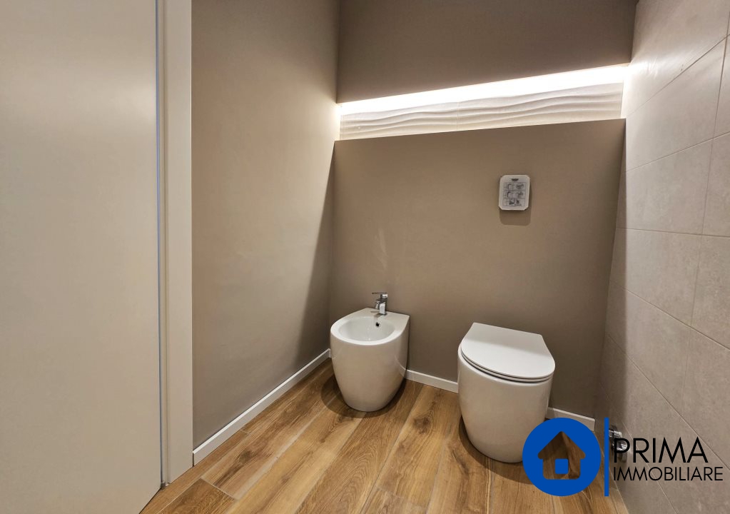 Una porta divide la zona notte che raggiungiamo da un disimpegno, qui sono presente una camera o studio, una camera con cabina armadio, il bagno con ampio box doccia e la camera padronale con bagno privato diviso in zona sanitari e zona lavabo e doccia.