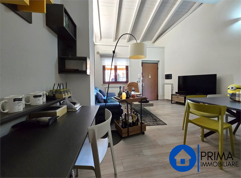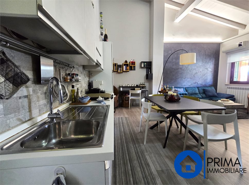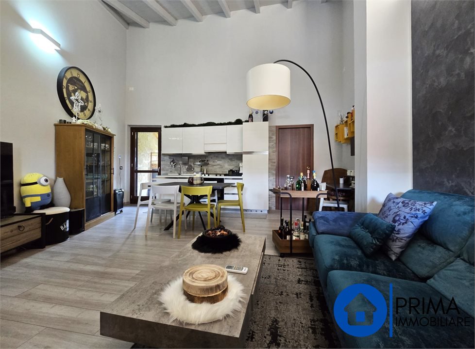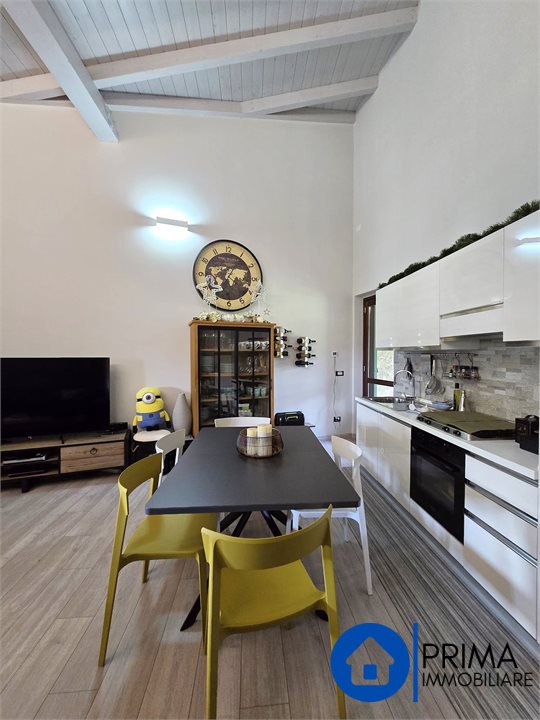 L'appartamento si trova al primo piano con accesso da una rampa di scale esterne verso un balconcino con cancello. Dal portoncino blindato entriamo nella splendida zona giorno open space composta da un angolo living e una zona pranzo con angolo cottura a vista, bellissimo l'alto soffitto con travi in legno a vista che consente di creare un soppalco per una zona hobby o uno studio.