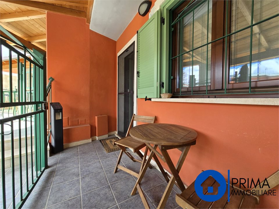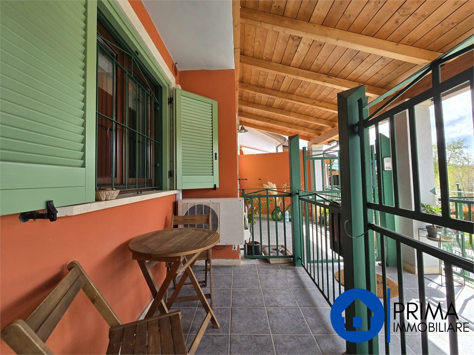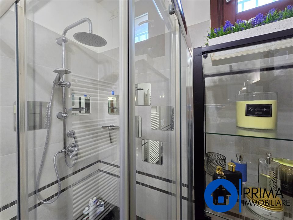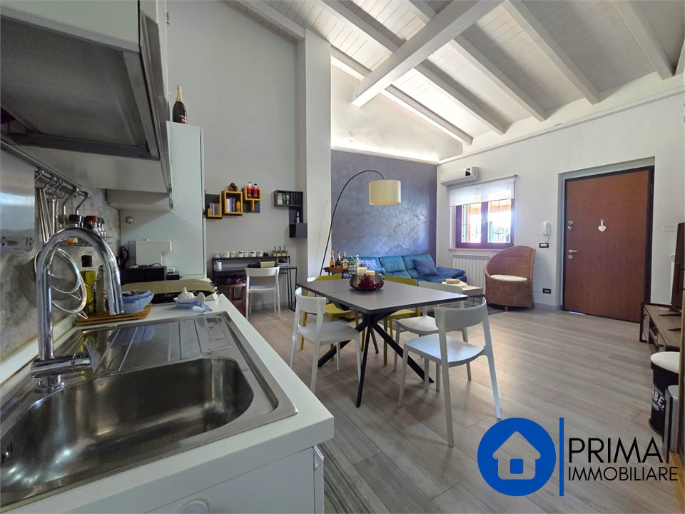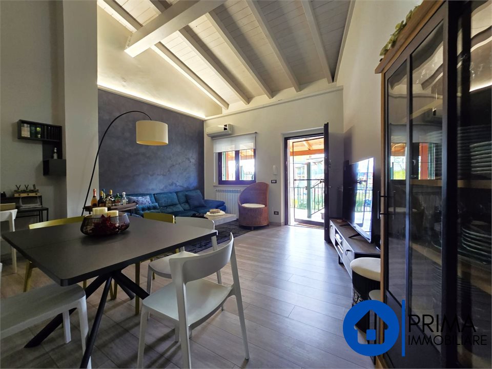 L'appartamento č in ottime condizioni, pari al nuovo! Nella zona giorno troviamo un'illuminazione a led studiata per valorizzarne il soffitto in travi in legno, č presente lo split per l'aria condizionata, a terra č stato posato un moderno pavimento grigio effetto legno e nelle camere invece c'č un caldo parquet in legno scuro.