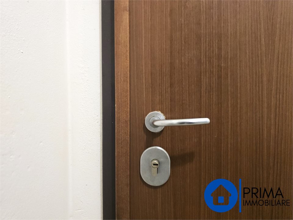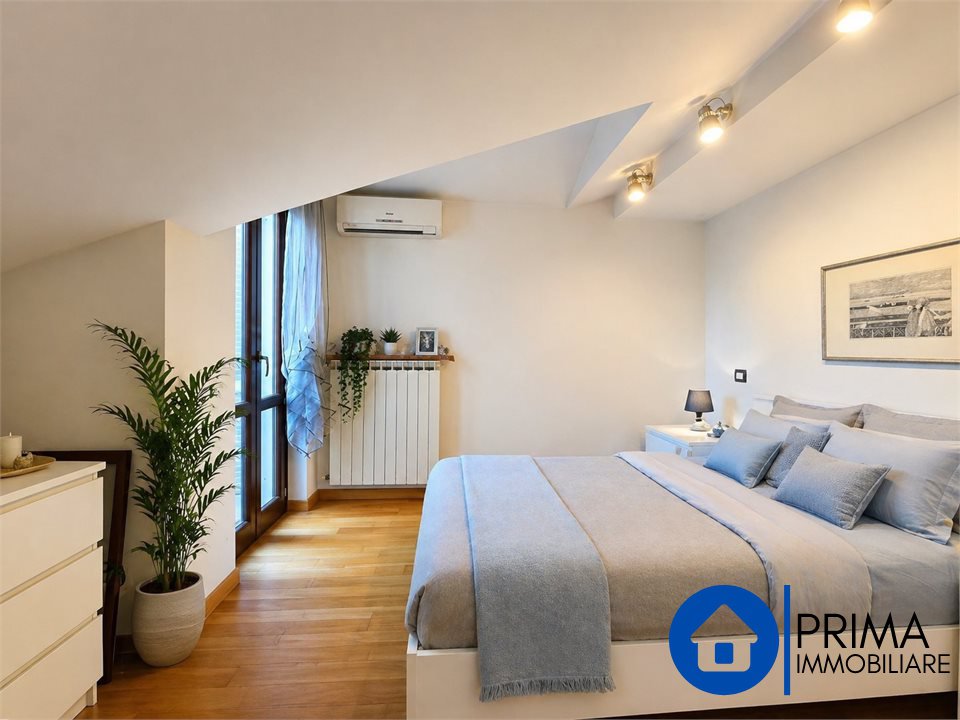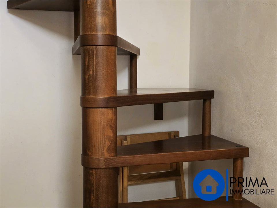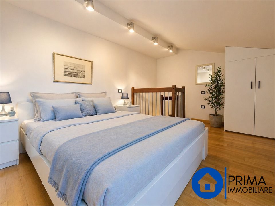 Si accede dal portoncino blindato verso la zona giorno open space con angolo cottura a vista, allo stesso livello un disimpegno con accesso da porta a scomparsa ci conduce verso il bagno con box doccia e impianto d'aspirazione e verso le scale a chiocciola che conducono alla zona notte. Al piano superiore troviamo la camera da letto con parquet posato a terra, illuminazione con faretti led incastonati nel cartongesso, split dell'aria condizionata e porta finestra verso la terrazza a tasca.