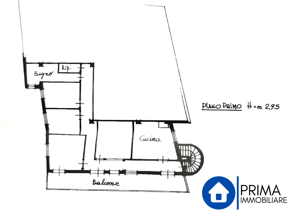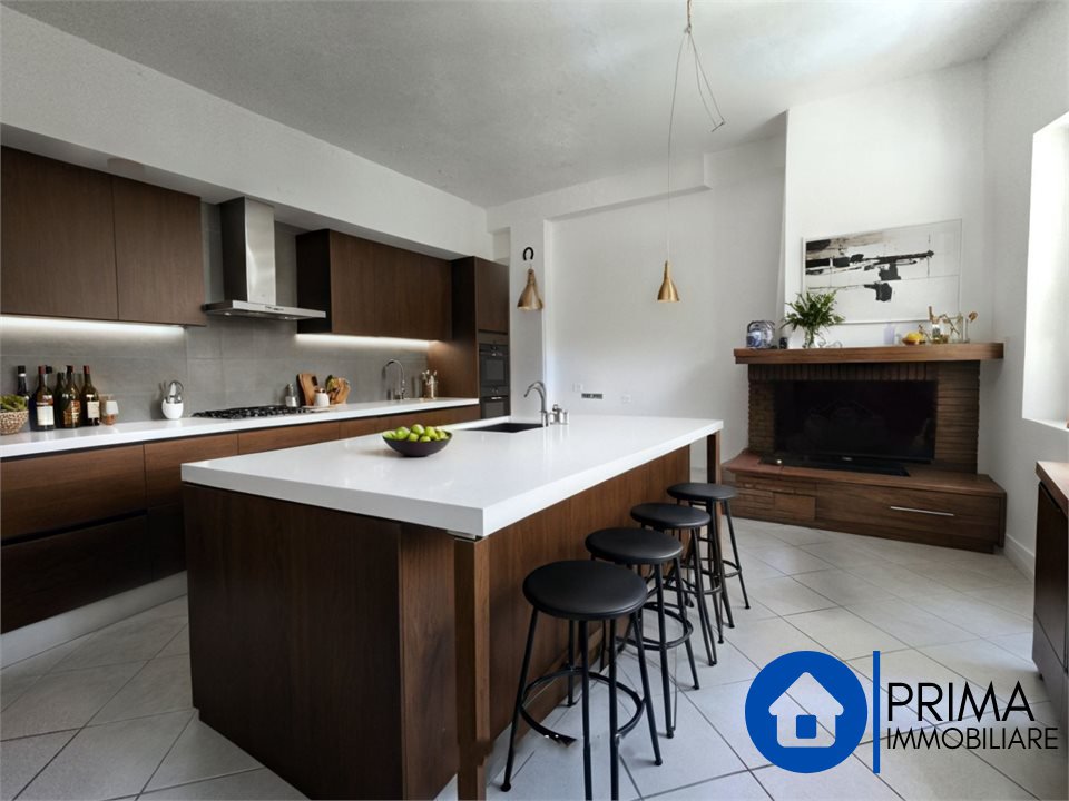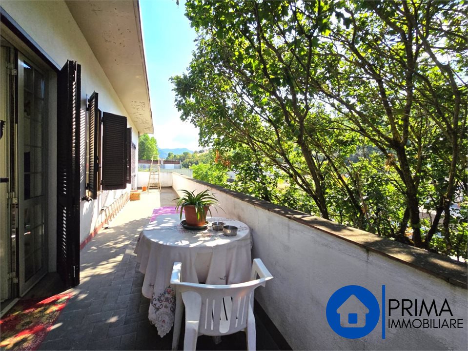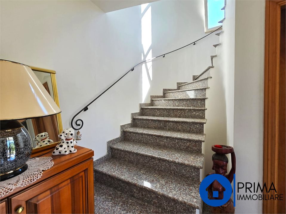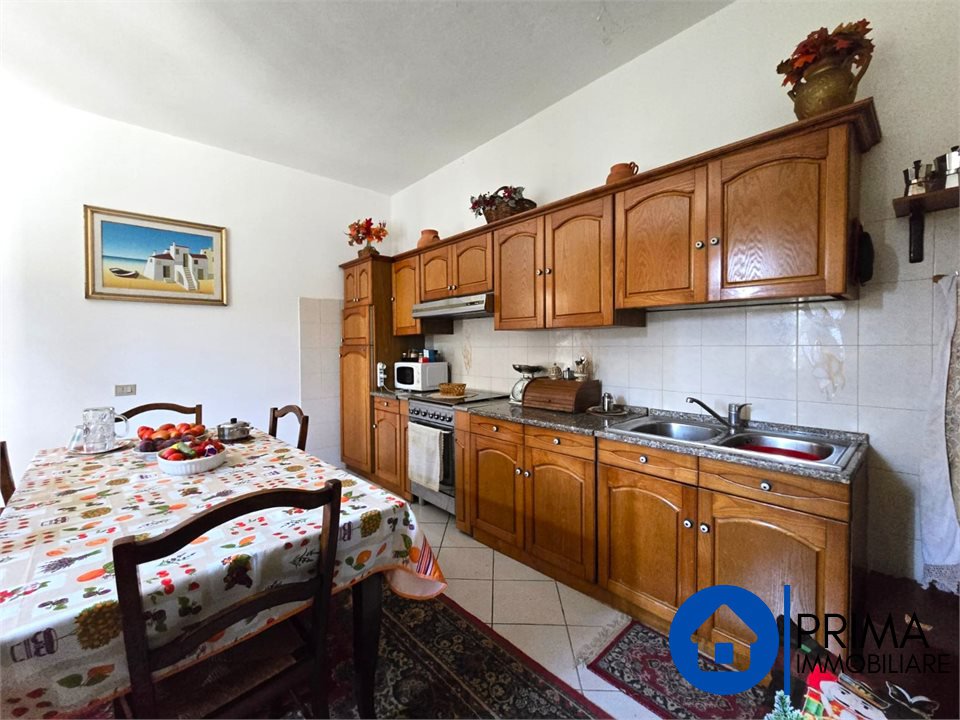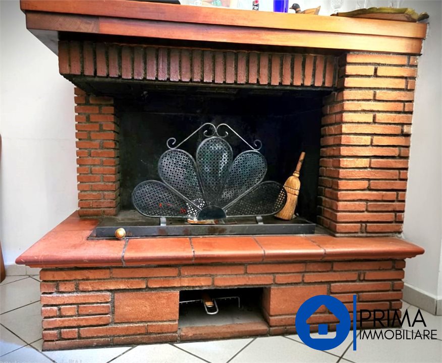-Al primo piano con un ingresso sia dall'esterno ed dall'interno dal locale, troviamo un grande appartamento composto da salone, cucina abitabile con camino, tre camere da letto matrimoniali, bagno con vasca, ripostiglio e un grande terrazzo con affaccio sul verde:
